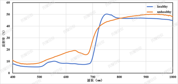 7. 病蟲害分析:可適用于植物病蟲害試驗(yàn),進(jìn)行病斑部分和健康部分光譜反射曲線進(jìn)行對(duì)比,通過對(duì)變化趨勢(shì)的研究可以對(duì)病害發(fā)生部分和嚴(yán)重程度進(jìn)行分析;